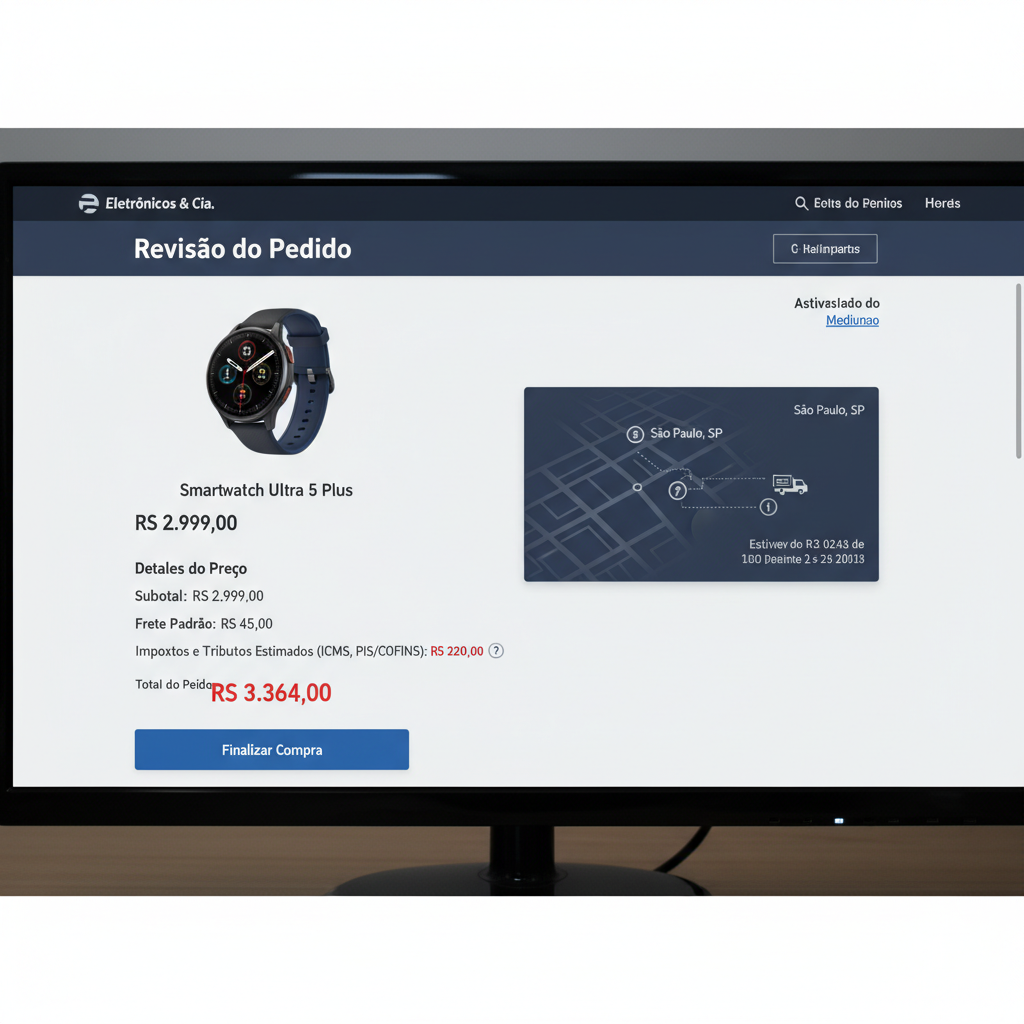 Na imagem, podemos ver um exemplo de como o preço final de um produto deve ser exibido, com o valor do item, frete e os tributos detalhados, para que o consumidor tenha total clareza do que está pagando.